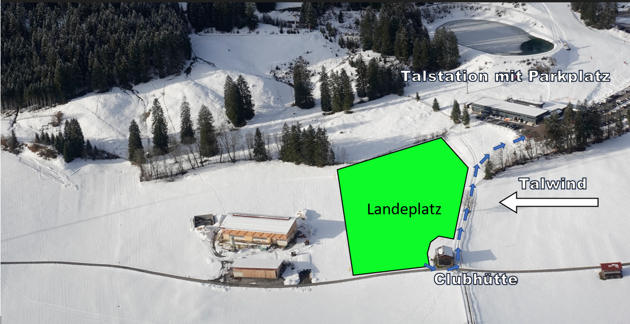Wir nutzen im Winter und Sommer den gleichen Landeplatz. Wir empfehlen dir, den Landeplatz vor dem Flug zu besichtigen, um dich mit den Gegebenheiten (leichte Hangneigung, landwirtschaftlichen Gebäuden, Bäume oder Stromleitungen, bzw. Ausweichmöglichkeiten…) vertraut zu machen.