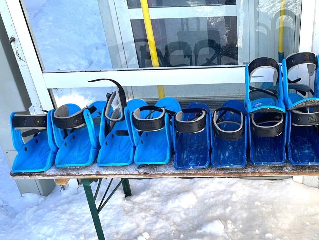 Für den Transport mit dem 4er-Sessellift sind die blauen Schneegleiter anzuziehen. Diese sind vor dem Einstieg in den 4er-Sessellift erhältlich und einfach an den Füßen zu befestigen.